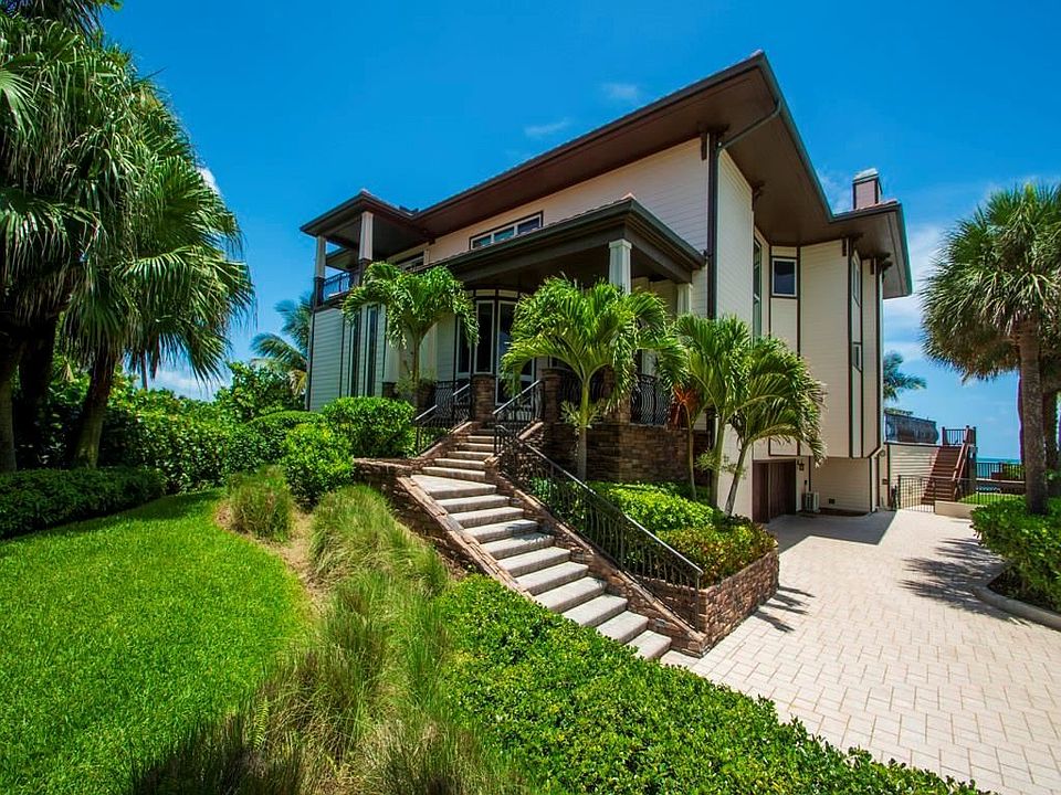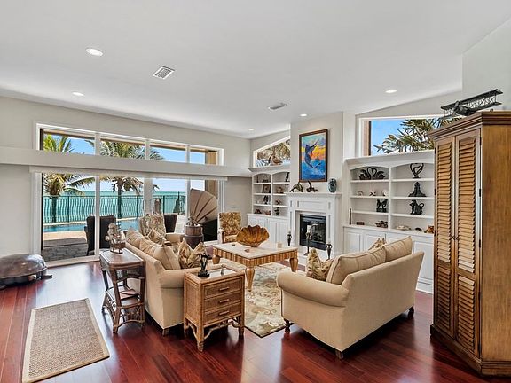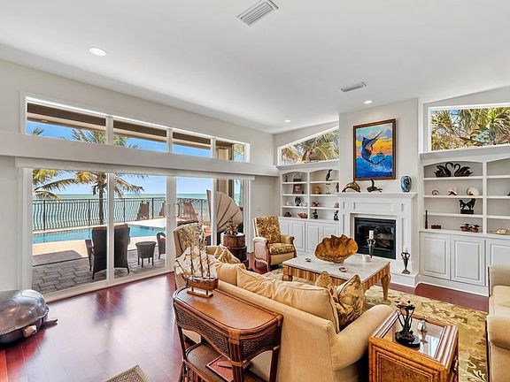 STUNNING oceanfront with long sandy beach views from most rooms! Sleek 3 bdrm + office, 4.5 bath, family rm, open kitchen, elevator. Wood flooring, magnificent sun room, super private heated pool overlooking the sea! Lovingly, thoroughly renovated + new roof in 2017. 4 car garage, ACd storage. Impact glass, electric shutters, newer ACs. Dimensions approximate.