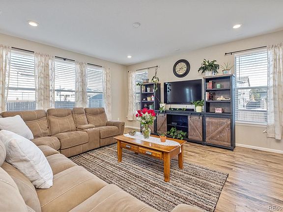 Nestled in the quiet Prairie Center Village neighborhood, this bright and open 2-story home features modern finishes and many designer upgrades throughout. The open concept main floor boasts 9' ceilings, engineered hardwood floors, tons of natural light through the expansive wall of windows and pre-wired surround sound in the great room. The well-appointed kitchen is perfect for entertaining with bar seating at an oversized center island, quartz counters, tile backsplash, 42’ cherry cabinetry, gas range and large pantry. Step. Out the large slider to your backyard oasis. The newly finished spacious patio overlooks professional landscaping with irrigation and a shed for all your tools and toys. Retreat to your primary suite, complete with an ensuite 5-piece bath and walk-in closet. Two large secondary bedrooms, a full bath, laundry and bonus loft space round out the upper floor. Family movie nights or watching the big game is ideal in the finished basement den. A 4th private bedroom, bathroom and storage space comprise the lower level. Jelly fish lighting, smart home technology and solar panels installed. This home is ideally located on the community’s largest corner lot and is only minutes from shopping, dining, DIA and major roadways. Do not hesitate, book your showing today!