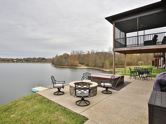 Welcome to Rivers Landing in Oldham County and to one of the best locations within the neighborhood. This home is positioned near the back gate which offers a quiet setting overlooking the entire lake. With many upgrades, starting with the hardwood flooring throughout the first floor, this house is going to impress you! The open floor plan with natural light from all the windows gives the first floor a warm feel. The kitchen features white granite counters matching the white cabinetry, and top of the line appliances including a wine cooler plus a pantry with built-ins. Entertaining made easy with the open dining area and great room. The great room, with a gas fireplace is flanked by built-in bookshelves, opens to a wonderful screened-in porch complete with surround sound. The first floor master bedroom also offers a view of the lake, hardwood flooring, and large walk-in closet. The master bathroom includes a jetted corner tub, double vanity and walk-in shower plus linen closet. The second floor features a very large bedroom, two closets and en-suite bathroom, perfect for the teen in your family. The finished walkout lower lever offers a large family room opening up to a patio overlooking the lake, ideal for entertaining or enjoying quiet time. Not to be missed is the bedroom with full ingress/egress window including large closet and full bath. Completing the lower level is an exercise room and additional storage. The dock on the lake is shared with the neighbor as well as the stairs down to the dock. Many, many upgrades!