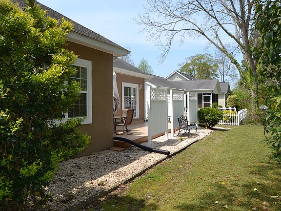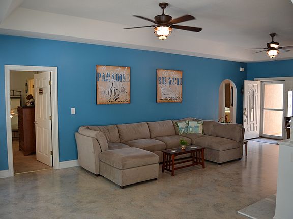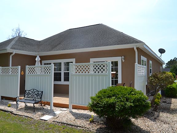 Looking for a home that is easy to maintain, energy efficient and hurricane resistant? This 3 bedroom/2 bath home has been well maintained and comes with tray ceilings in dining, living area, master bedroom and a cathedral ceiling in front bedroom. The kitchen features 42" tall cabinets, corian countertops, and a brushed nickel faucet. The finishing is above average with 6" baseboard, 3 1/2 " window trim and 10" window sills throughout the majority of home. The dining area is part of open living room dining with fireplace. Main living areas are stained concrete flooring and carpet. Outside stamped rear yard patio with privacy screen as well as stamped concrete driveway. Jacuzzi tub in and his/her sinks in master bathroom.