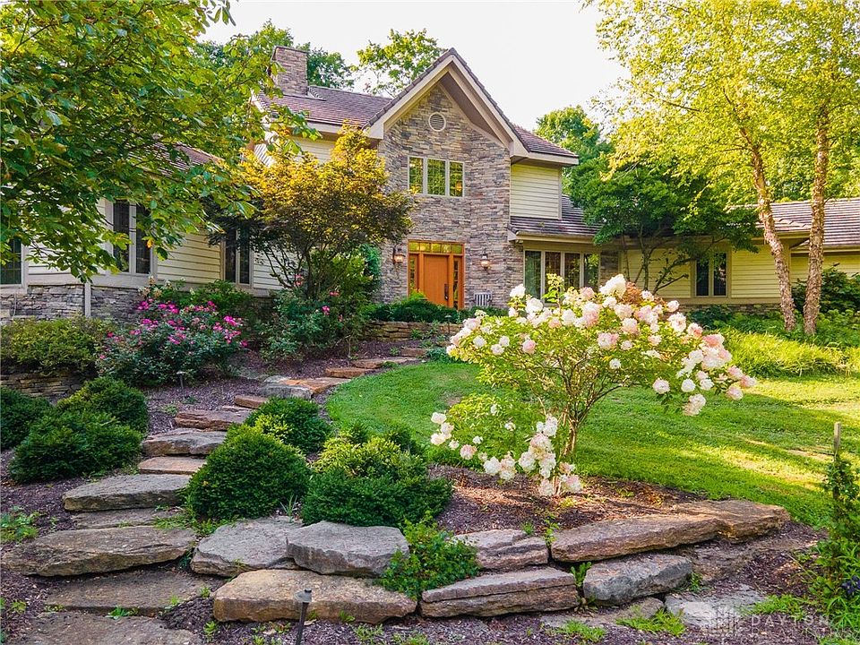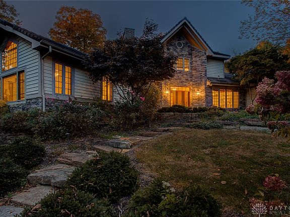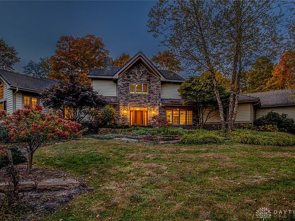 This custom, truly one-of-a-kind home in Sugarcreek Twp. is one for the books! Check out this 5 bed/7 bath home built by Design Homes. 3.9 acres of woods...beautifully landscaped with two ponds and a "Treehouse" tiny home tucked into the woods - currently run as an Airbnb and consistently booked out! The yard is rich in native plants and was planted with permaculture design in mind, using zero chemicals. This home is roofed in concrete tiles - maintenance free and really unique. Inside you'll have plenty of space for family...a large entertaining kitchen, a first floor owner's suite and a cedar cathedral ceiling in the spacious living room. You'll find a woodburning fireplace (with a gas starter) separating the kitchen and living room, and another in the lower level. Two bedroom suites are tucked away upstairs for the kids! This home is heated and cooled using a geothermal system, keeping energy costs down while being environmentally friendly. The entire home is handicapped accessible, with an elevator from the basement all the way to the second floor (currently unused, but stored in the lower level for future use). The private walkout basement is perfect for an in-laws suite or when guests are in town. This home is in such a private, country-like location - but just minutes from Bellbrook! Schedule your private showing today!