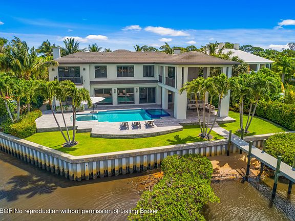 With the utmost of detail and craftmanship, this 2016 impeccably built home by Turtle Beach Construction sits on three-quarters of an acre with 128 ft of panoramic views of the Loxahatchee River. This spectacular home features 8,950 square feet, gorgeous wood and stone floors throughout, impact glass and doors, 5 spacious bedrooms, 7.5 baths, spectacular river views from almost every room and rare four car garage. The spacious and luxurious master suite has two huge closets, a stunning bathroom with oversized shower, soaking tub and his and her vanities. This awesome gourmet kitchen consists of an oversized island, top of the line stainless-steel appliances and modern style cabinets, and opens to the dining area and family room, making this the best entertaining area and views anyone ask for! Additional entertaining is steps away and adjacent to the kitchen. The large covered patio features a summer kitchen, outdoor bar overlooking a resort style pool, and neatly landscaped backyard. The Thru Flow dock is equipped with a 12,000 lb boat lift. The additional features include an additional first floor bedroom, two laundry rooms, wine cellar, elevator, three spacious second floor bedrooms with gigantic second floor media room and balcony.