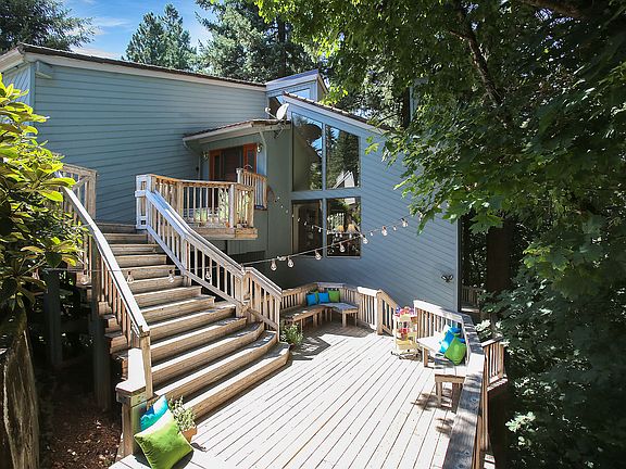 Built for a former TrailBlazer, this Incredible 1970s tree house w/soaring vaulted redwood ceilings & walls of windows immerses you in the forest. Stunning 800 sq.ft Master w/en suite & soaking tub, walk in closet, vaulted ceilings & slider to private upper deck. Relax in the built-in hot tub amid the trees, burbling creek & songbirds. Lower level family room w/wet bar & fireplace. 4th BR may be non-conforming. Nearby parks & West Linn schools also!