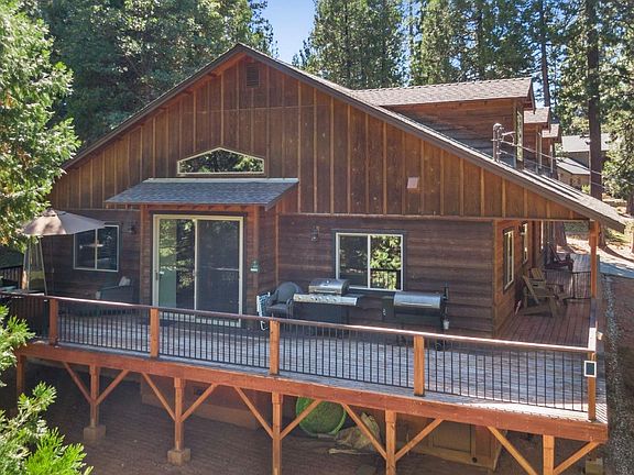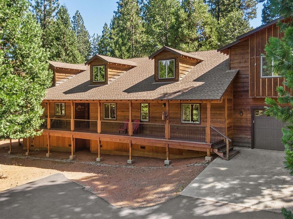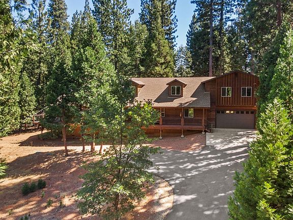 Experience true mountain luxury at this custom built craftsman style gorgeous Sierra lodge. With 3568 square feet, enter into the stunning great room with vaulted ceilings and exquisite old world circle sawn hand wood floors along with a gas log stove set into a beautiful slate hearth. The gourmet kitchen is a chef's dream with granite counters and stainless steel appliances. Dine indoors or out on the 500+ square feet of redwood decking surrounded by pines. Three bedrooms are master suites with its own bathroom + a fourth bedroom can act as an office or a bedroom w/a Jack and Jill bathroom. The huge entertainment room upstairs offers a multiple of uses from a theatre to a game room plus extra space for a slew of bunk beds. A spacious 2 car garage is insulated and completely finished. The wavy cedar siding rounds out that western mountain look. Located in Fly-In Acres with access to a private lake with large sandy beach, picnic tables, sand volleyball, horseshoes, ping pong, disc golf and more. This luxurious lodge is perfect for all seasons!