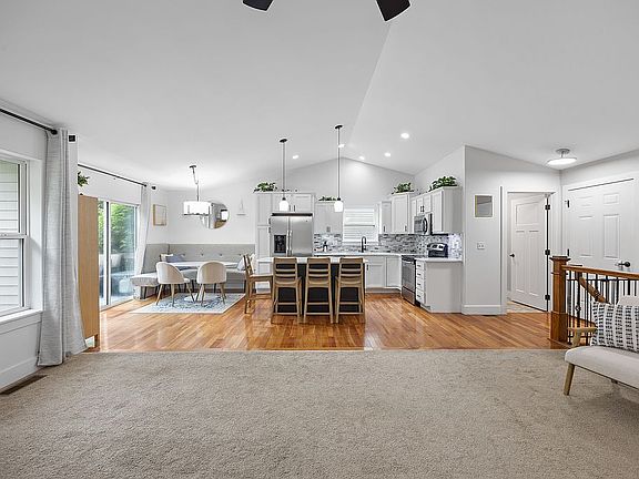 Relax in the spacious family room featuring a gas fireplace, seamlessly connected to the kitchen and enhanced by vaulted ceilings. The large island and dinette space is perfect for casual dining or hosting.
