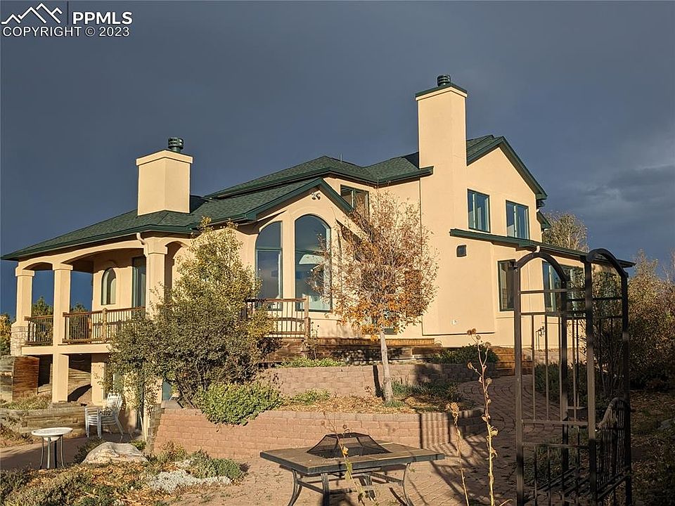 This single-family custom house sits on a vast 5.01 acre prairie lot and has very RARE commanding Pike's Peak views from every one of the 14, large south-facing windows. This newly-roofed (2023) home was built at the apex of a loop of road, up a driveway lined with shade trees, and on top a hill which was built by trucking in multiple loads of dirt to accommodate a walk-out basement. It's landscaped tall 20yo trees, raised flower beds, cobblestone paths, multi-zone sprinkler, firepits, hedge rooms, contemplation rock, designed by Master Gardeners for ease of upkeep. Built for privacy, view corridor, durability.Primary nears perfection with separate his/hers walk-in closets w/ sinks vanities, shelving, natural light. SE potters room w/ deep sink/dog wash. Boasts HUGE unfinished basement (2211sqft), multiple storage rooms, plumed for a bathroom, deep sink, possible home theater, in-law suite, workshop, etc and has own entrance/sliding glass door. Spacious 3-car garage built extra-wide for more car-door room, storage, shelves. Decks/porches on all 4sides. Floorplan is Susanka-style comfort and livability, nooks, window seats, half-walls hide the back of couches. Rooms specifically set to capture the views. Multiple heat zones so parts of house can be closed off with glass-paneled doors using strong passive solar. window lit hallway draw you into the home. Keeping with the style, the main floor has an “away” room and an office which could be converted to a main-floor primary and large bathroom, or possibly two more bedrooms. The office has shelving and built-in closets designed to fit clothing dressers if the room was converted to a bedroom. The south-east corner has a “morning room” for drinking coffee and reading the news. There is a powerful central vacuum system, two wood and one gas fireplaces, wood shelving, backlit arches and hidden speakers. Extensive kitchen counter-space,baker's alcove/appliance area,hidden pet food area,new oven/micro/fridge,coffee bar.