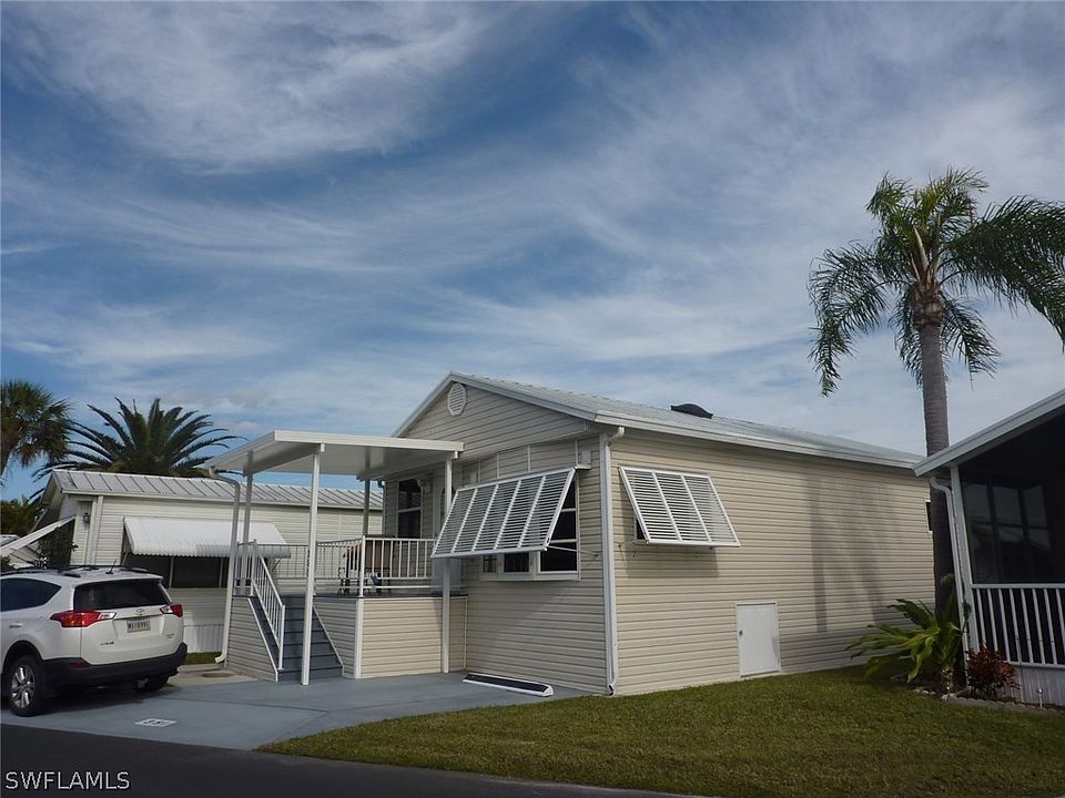 Palmetto Palms- Active adult park near beaches, outlet shopping, Sanibel beaches, hospitals, bike trails to everywhere. this is a very desirable 2 bedroom/2bath hi rise unit on a wide 2 way street. Original side is a 1987 and in 2000 it was raised up and the second side added. It has high ceilings,, laminate floors, murphy bed in the second bedroom, new 100 amp elec. service from the pole to the house, (it has a surge protecftor) stacking w/d, smooth top stove, dishwasher, a/c 8 yrs old, water heater 2 yrs old, nice covered front porch. This home is exceptionally clean and ready to move in to. this park is completely fenced in and gated. The biggest value in South West Fort Myers. Note: