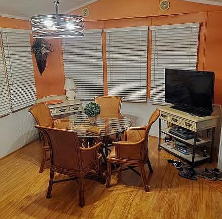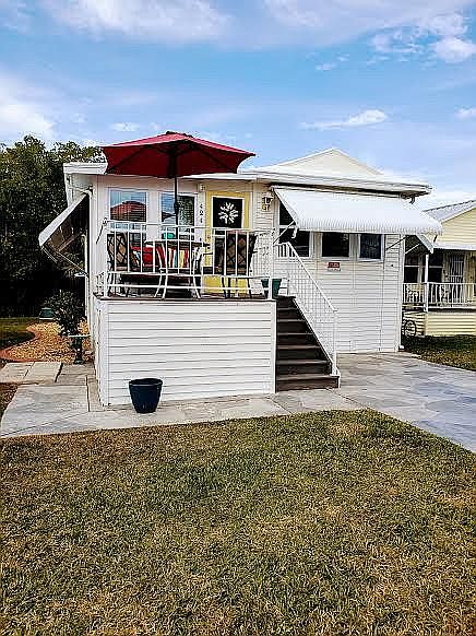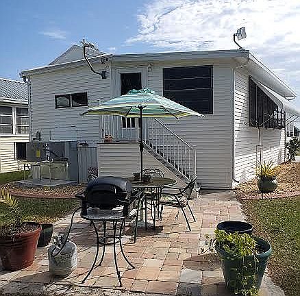 - Welcome to Palmetto Palms where you own your land! This home is a raised home and located on sought after A STREET on the preserve with a spacious back yard with no homes behind with a paver patio! Living room is so large, it could easily be made into a second bedroom. This home offers granite kitchen counters with all newer stainless appliances. New flooring. All new hurricane impact windows in main part of home with new blinds. Fabulous front deck! New furniture and high end new queen bedroom mattress. Large laundry room with full size washer and dryer that is so large a half bath could easily be added. Brand new Air conditioner and Heat. Palmetto Palms is an over 55 community with a short bike ride to Beaches and Sanibel Island. Offering Tennis, Pickle ball, Library, Clubhouse, Volleyball and Pool with so much more. This home is move in ready. Clean and immaculate come take a look you will not be disappointed! Turn Key.