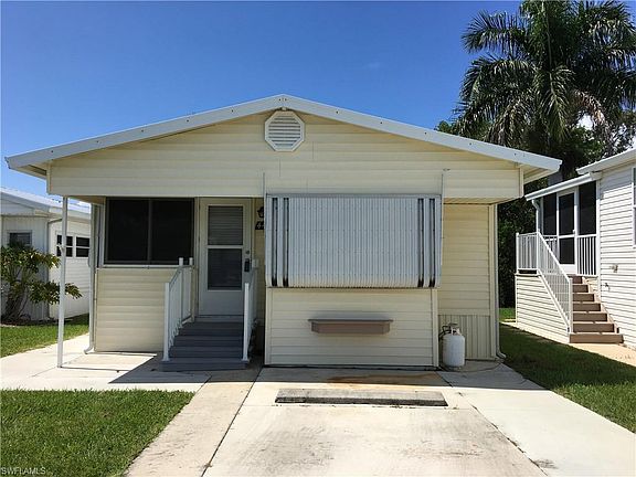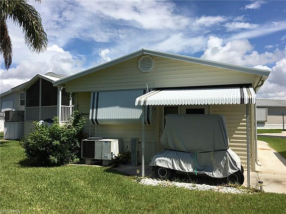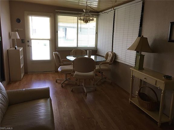 This one bedroom, one bathroom home has a bright kitchen with a bank of windows above the kitchen sink and a gas cooktop and wall oven. The wood flooring is updated throughout and it has a large closet off the hallway to the bed and bath for extra storage. You own your land here, and are between Ft Myers Beach and Sanibel. This is a very active fun filled adult park with pools, tennis, volleyball, trails, boat storage and lots more. This lot is close to the second pool and is on the perimeter of the park giving you privacy behind your unit. The community is entirely fenced and gated close to shopping and hospitals and even includes a golf cart with the purchase.