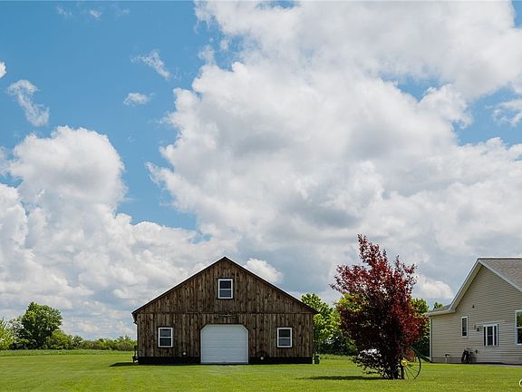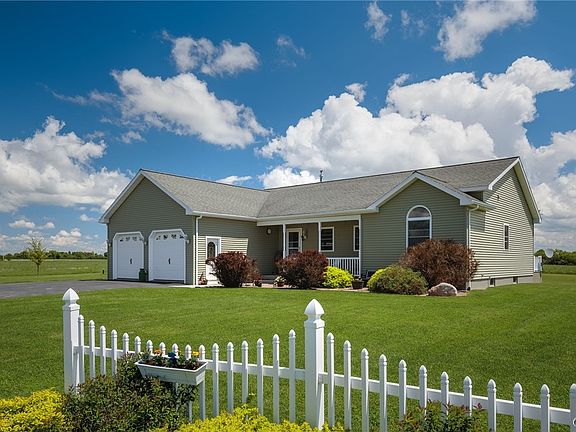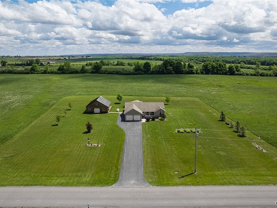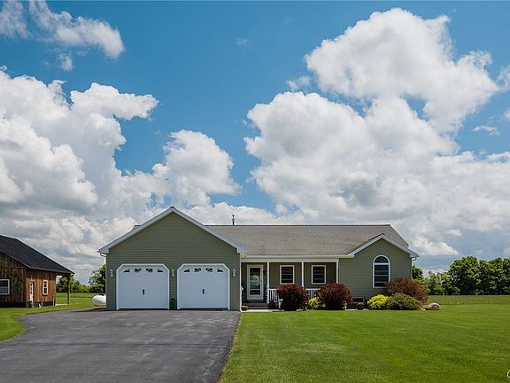 Holy acreage! Check out this newer built ranch home in the Sackets Harbor School District. This custom built home features 4 bedrooms, 2 full baths and full laundry room . The much preferred open layout boasts a HUGE living room, good sized kitchen with ample cupboard and counter space, walkthrough dining area and a gorgeous, 4 season sun room overlooking the back yard with sliding glass doors leading to the deck. The crawlspace/basement is 4 ft tall and runs the length of the home making its great for clean, dry storage. Did I mention the entire home contains IN FLOOR HEATING? This makes for much more efficient heating. The attached garage also contains IN FLOOR heat. The brand new 2 STORY pole barn/workshop is also insulated and heated. Use it as a barn for animals, storage, or a huge workshop.