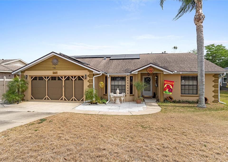 Best Deal in Deltona! New water heater just installed! This Charming & Spacious 3-bedroom, 2-bathroom home offers 1,600 sqft of thoughtfully designed living space, plus a flex room that can be transformed into a 4th bedroom, office, playroom, or family room—whatever suits your needs! Solar panels keep your electric bill low. With a homemade electric generator with 8 solar panels ($12k value) that stays with the home! Inside you'll step into a bright and open living area, featuring vaulted ceilings and a stunning brick fireplace—perfect for cozy nights in. The kitchen is a chef’s dream with wood cabinets, granite countertops, stainless steel appliances, and a charming bay window that bathes the space in natural light—an ideal spot for your breakfast nook. The split floor plan provides privacy, with two bedrooms and a full bath on one side and the primary suite on the other, complete with a walk-in closet and ensuite bathroom. Outside, this home truly shines! The oversized driveway, 2-car garage, and carport provide plenty of space for parking—including room for your boat! Need extra storage? You’ll love the two sheds. The enclosed rear porch is perfect for relaxing, while the serene backyard features a small pond with a garden bridge—a peaceful retreat right at home. Plus, solar panels help keep energy costs low! Don’t miss this opportunity—schedule your private showing today!