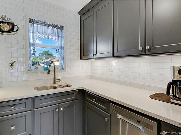 You won't find a nicer remodeled (2022) 55+ condo with new kitchen cabinets, appliances, flooring, bathroom, impact sliders and kitchen window. Kitchen cabinets are hardwoods, painted blue midnight, that extend to ceiling. Stainless steel refrigerator, dishwasher, stove and vent. Quartz countertops and stainless sink. Subway tile backsplash extends to ceiling. Flooring in main living/dining area and kitchen is vinyl plank wood look with foam backing. Stack stone wall in dining area. Bathroom tile and vanity are new 2022. Tub/shower were remodeld 2018. Living room has built in bookcase/entertainment center with electric fireplace that emits heat. Baseboard along all walls is new. Bedroom has new Berber carpet. AC replaced in 2015. Outside lanai has new screens and 2 storage closets. Golf included with HOA fees plus 2 clubhouses, pool, kayak launch/storage, bocci, shuffleboard, library, fitness center, on site manager. Monterey Y&CC is a well maintained community with ample activities.