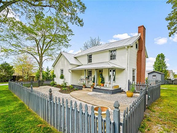 This adorable farmhouse, on .61 acres, is a beautiful blend of modern convenience and warm charm! The updated kitchen with white marble tops, white subway tile, gas stove, eat in breakfast area, opens to the large laundry with extra cabinets. Huge great room with warm fireplace, beamed ceilings and built-in shelves. Main level primary bedroom with large tile walk-in shower, walk-in closet, additional separate closet and linen. Second bedroom on main has a full guest bath nearby. The third bedroom and full bath are upstairs where you can see the old hand scraped logs. Enjoy the shade of the old trees, the abundant amount of outdoor space for entertaining, the nice covered front porch. Large two garage with additional space storage. One-year HomeServices warranty included. Wonderful country living with city convenience.