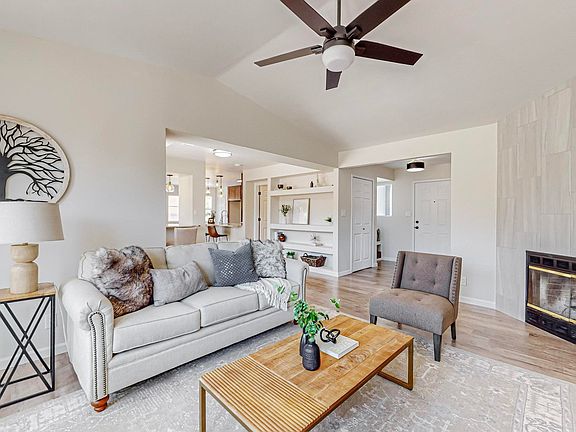 Welcome home, sweet home! This beautifully remodeled 3 bedroom, 2 bathroom home with a 2 car garage is ready for you to move in and enjoy. With high ceilings and skylights, this house is filled with natural light, giving it a spacious feel. Recent updates have transformed this home into a modern oasis, featuring a new roof, windows, stucco, new plumbing fixtures and valves, fresh paint inside and out, laminate wood and custom tile flooring, granite countertops, cabinets, and vanities, floor-to-ceiling tiles in bathroom and fireplace surround. Updated light fixtures, and ceiling fans add a touch of sophistication. The xeriscaped front yard offers low maintenance and a welcoming curb appeal. The backyard is a clean slate, offering garden boxes for your gardening needs. Bring your veggies,
