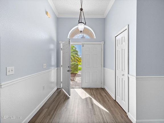 This gorgeous Jacksonville rental offers breathtaking water views and sits on nearly a quarter-acre in Sutton Lakes. Inside, you'll find vaulted ceilings, upgraded LVP flooring, crown molding, and an inviting open layout perfect for entertaining. The kitchen features Brazilian cherry cabinetry, granite counters, and stainless steel appliances. The primary suite overlooks the water and includes a walk-in closet plus a luxurious en suite with a frameless tiled shower, garden tub, and elegant vanity.