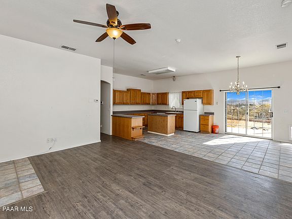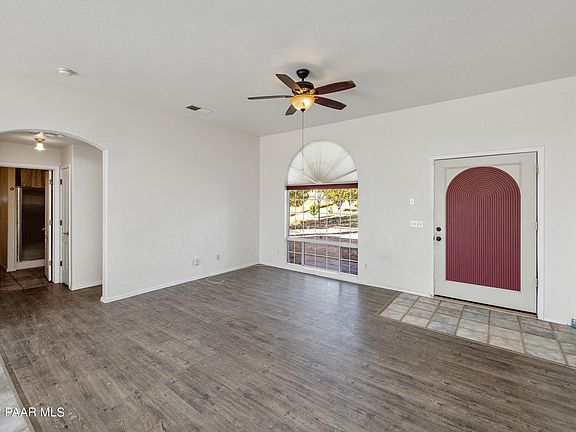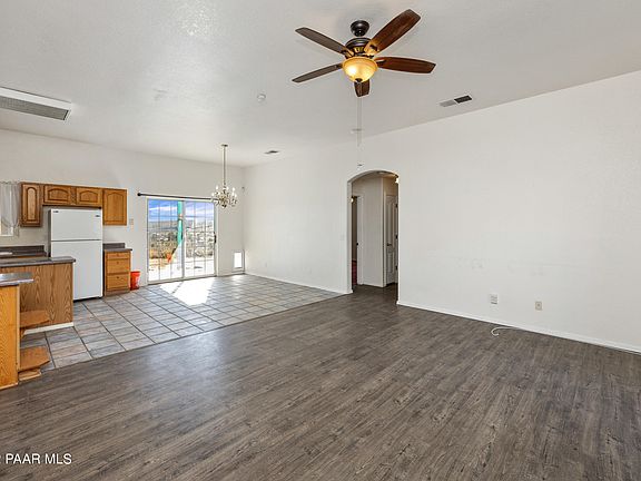 A very well maintained and spacious open plan Santa Fe-style 3 bed, 2 full bath home in Mayer with mountain views on a large 0.742 acre lot. The generous tiled kitchen features attractive and extensive cabinetry, laminate worktops and an island with cooktop plus a full suite of appliances. The dining room has excellent natural lighting via the double door that overlooks the covered patio with hot tub and the back yard. The bedrooms are large and the master features an additional attached room, offering a wide range of possibilities, including office space or a gym. Laundry room with plenty of storage. Recent updates include a new roof, ac and furnace. Two car garage. Landscaping to front and rear. Two large storage sheds. No HOA.