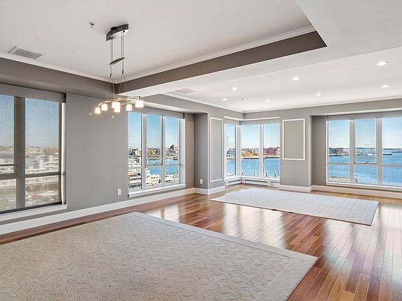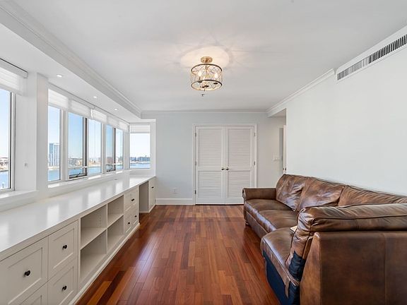Stunning, sophisticated luxury condo located at The Flagship Wharf, offering spectacular views of Boston Harbor and the City Skyline. This magnificent corner unit provides amazing water views from every window, a superb open living room/dining room area, custom designed kitchen, high end appliances, breakfast bar leading to a private deck. Luxurious master bedroom with an ensuite bathroom, 2 additional bedrooms, walk-in closet, hardwood floor throughout, beautiful lighting, amble storage, laundry room, 2 parking spaces, pet friendly. Flagship Wharf is professionally managed, and offers 24 hr. concierge, gym, common library, extra storage space. Easy access to major highway, logan airport, water shuttle.
