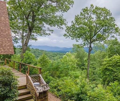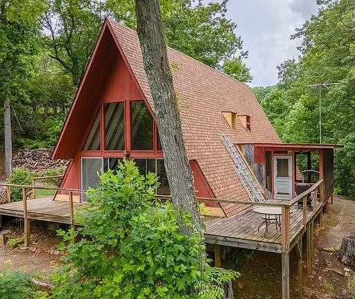 This is the unique you've been searching for! This A Frame is a hidden gem waiting to be brought back to its glory. It offers a private setting and has an additional lot to control your big view. New roof was installed April 2023. Vaulted ceilings with beams throughout, tall brick wood burning fireplace, galley kitchen, 3 bedrooms, 2 baths and an open loft to take in the mountains in the distance. The third bedroom upstairs has a private balcony, the primary and secondary bedrooms on the main level walk out onto the back porch. Front and back screened porches off the 3/4 wrap-around open porch offers outdoor space to take in nature and enjoy the views with mountain laurel surrounding the property. This has so much potential and is waiting for you to revive it. You don't want to miss the view and this unique home!