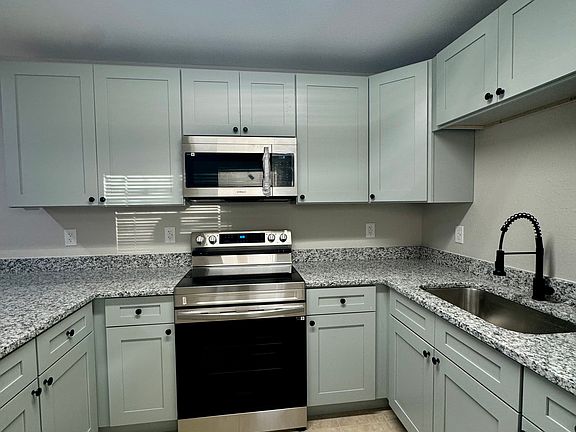Contemporary finishesFreshly renovated homeGranite countertopsThoughtful updatesStylish gray kitchenNewly remodeled bathroomPlenty of cabinet space
