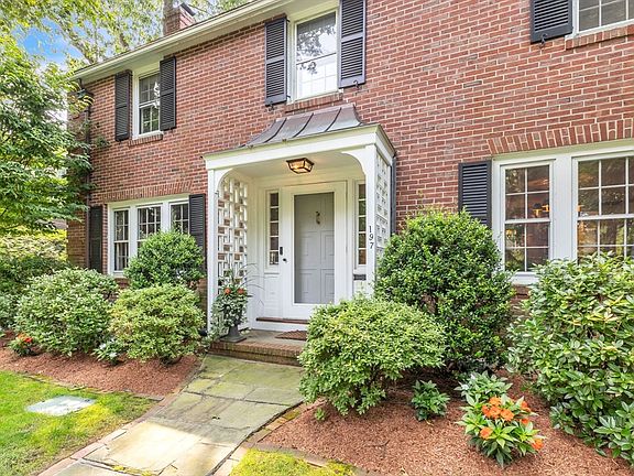 Classic Kibbe BRICK colonial offers stately curb appeal, quality, good proportions, custom millwork, hardwoods, circular flow & inviting functional interiors in coveted neighborhood. Gracious foyer w/wide turned staircase invites w/sight lines of living room w/gas fireplace to dining room featuring custom corner cabinet w/arched glass fronts. Kitchen showcases SieMatic white cabinetry, granite countertops, high-end appliances, center island & pantry closet w/wide opening to great room addition w/custom bookcases & loads of natural light through newer windows- all framing vistas of well landscaped yard w/park side living w/direct access to woods & walking trails plus a beautiful Goshen stone patio, stone walls & custom designed outdoor grill. 2nd floor houses primary suite w/high-end renovated bath w/double vanity & walk-in tiled shower, 3 more bedrooms, convenient laundry closet & classic black & white full bath. Walk-up attic provides great storage space and/or future living space.