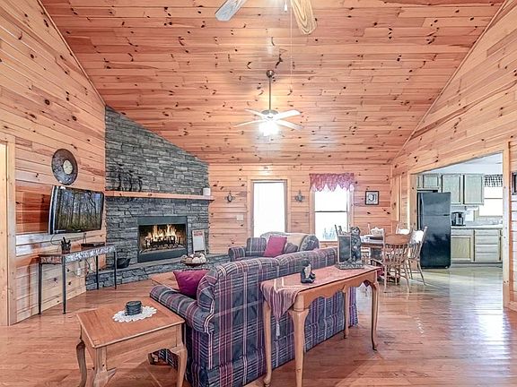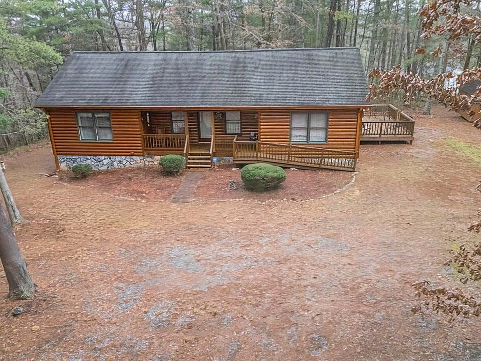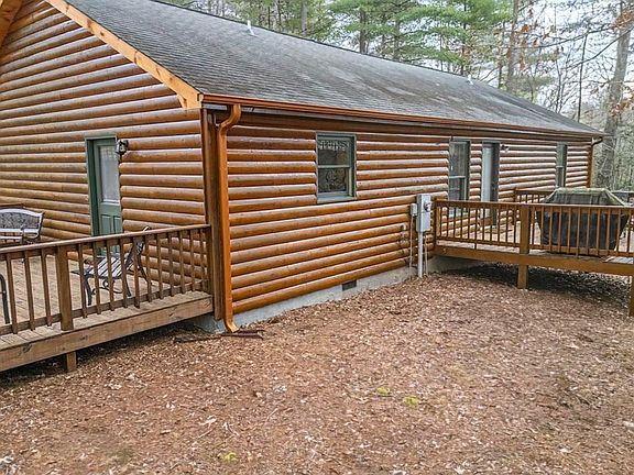 This lovely one-level, ranch-style Log Sided Cabin situated on a level gentle 1-acre lot with a pretty seasonal mountain view offers easy living. Easy paved road access to the property where the cabin sits back off the road in its own private niche! The cabin home offers a large side deck for family & friend gatherings as well as a back deck for viewing the pretty seasonal mtn view & enjoying your favorite meal of the day. The split floor plan offers privacy for the spacious master suite on one side of the home & the 2 bedrooms on the other side sharing a Jack and Jill bath. The Large Great room offers tons of space & includes a sizable stoned gas log fireplace perfect for the chilly mountain air as well as a 1/2 bath with easy access for your guests. This is truly a great Cabin on a private wooded lot w/a storage Bldg, fire pit area & much more. Come take a look and see for yourself!
