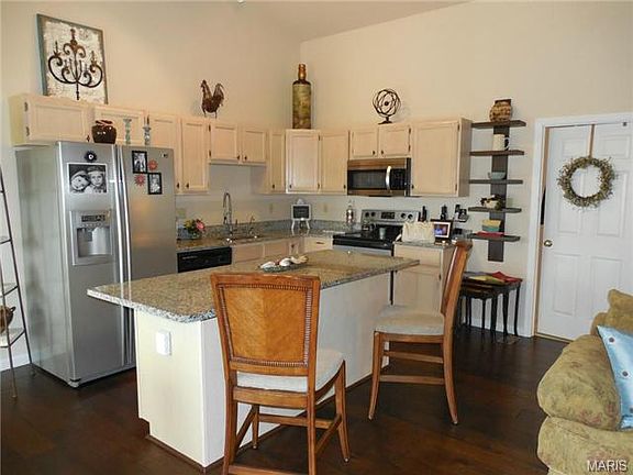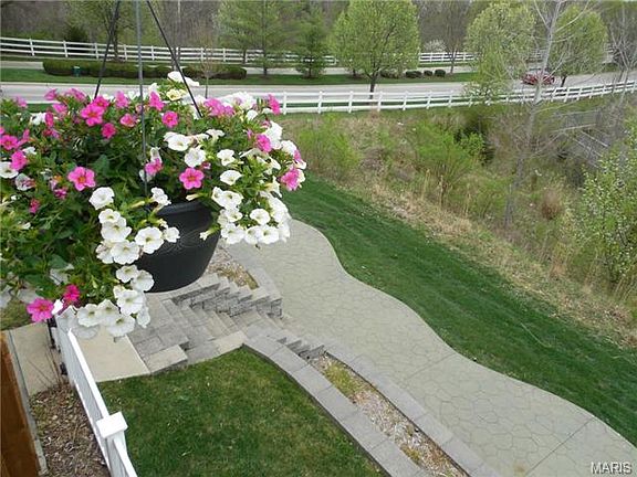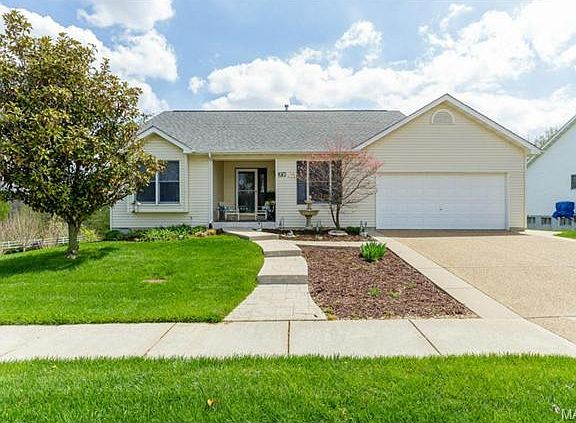 A precise representation of an open floor plan, 197 Marshall has been renovated &"dolled up". The "popcorn ceilings" have been scraped, repaired and painted, throughout the main level of the 1434 sf home. The entire home has a fresh coat of paint in today's desired color pallet. Engineered hardwood floor was installed throughout the main level of the entertaining area and master bedroom. Granite counter tops and back splashes add to the elegance of the open area. Some updated lighting, newer appliances, termite prevention, irrigation system update and yard care have been repaired or installed. The LL walk out basement has a sleeping area, full bath & family room with arough in for a bar or kitchenette. A pellet stove nestles in the corner. The property backs to common ground and a trickling creek. It has extensive hardscape for the yard's beauty. Located across from one of the subdivison pools and the club house, the home is in the Wentzville/Timberland School system.