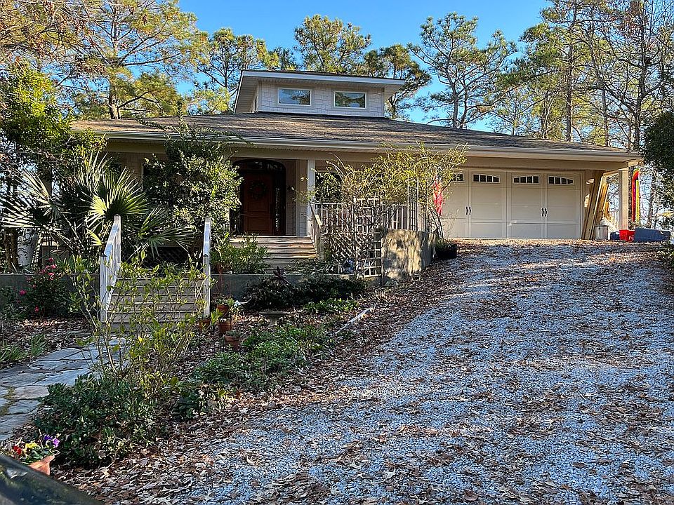 Original home design made with quality craftsmanship and materials. Expensive few the Neuse river. Set back off the road on a large landscaped lot in Neuse Winds subdivision. It has a dedicated boat slip on Orchard Creek. Enter this home into an open floor plan and an oak spiral staircase ascending to Cupolla surrounded with windows. Beautiful oak floors, doors and woodwork throughout the 2157 square-foot one story home. Kitchen has recently ceramic tile backsplash, stainless appliances granite countertop. All appliances convey including washer and dryer. Oak Cathedral ceilings in living area with floor to ceiling windows. French doors lead to a screen porch big enough for dining and entertaining. Primary bedroom is embraced by floor to ceiling windows. Recently renovated bath has tile shower with glass doors. Walk-in closet has access to attic storage. There is a beautifully designed guest suite with living area, bedroom and full private bath. It also has a private entrance in the 2 1/2 car garage that is elevated to the living areas. Garage has built in workbench and utility sink. House was designed for wheelchair accessibility throughout, wide doors slide under sinks, walk-in shower. Last but not least a dedicated boat slip on Orchard Creek which is great for fishing canoeing and kayaking with easy access to the ICW.