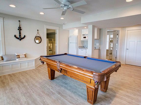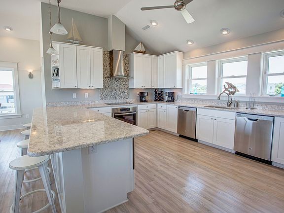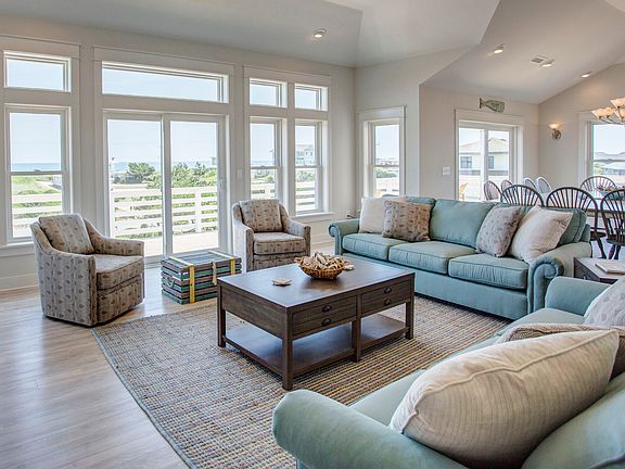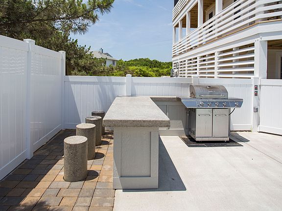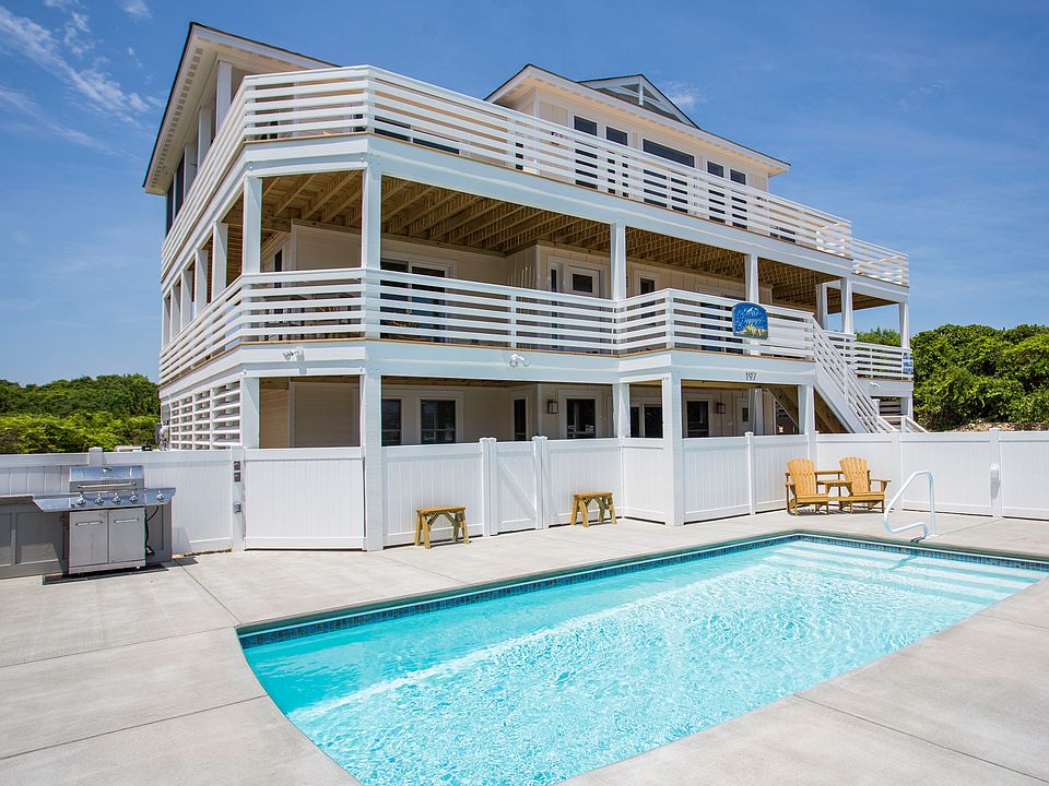 Vacation bliss awaits at Seaside Serenade, a brand new, breezy, six- bedroom, semi-oceanfront estate in Southern Shores. Highlighted by professional interior design, you'll find an atmosphere of soft hues of aqua, gray, white and cream which offer an elegant, yet relaxing coastal feel. Seaside Serenade is situated in a tranquil neighborhood, with the beach access located just across the street. Outside you'll enjoy a professionally landscaped area designed with outdoor entertainment in mind which includes a 14x26 heated, saltwater pool, six-seat hot tub, bocce/corn hole and sail- shaded sand play area. Enjoy outdoor bar-b-que area with built-in countertop cooking area with gas grill & bar seating, making this area a fun evening gathering space! Two outdoor showers and a fish cleaning area are located along the south side of the house. Inside, the game room features a pool table, built in bench seats, HDTV with DirecTV and Blu-Ray player with Apps, and a kitchenette complete with sink, dishwasher, microwave, and fridge/freezer with ice maker. Two built-in bunk sets in the two ground level bedrooms make this a great space for kids! The functional first floor design features three distinctive KING master bedrooms, all with sliding doors opening to covered decks. The mid- level living area has direct deck access and connects to the foyer entranceway. The separate touchdown workspace includes a built-in desktop with shelves and seating. The oversized laundry room includes shelving, hanging space and a full washer and dryer. This level also has a special needs accessible bathroom and all floors have access to the elevator. The second floor is spacious and can accommodate all your guests with comfortable seating all round. The kitchen boasts quartz countertops, stainless steel appliances, including two dishwashers, and separate professional series refrigerator and freezer with ice maker. The dining features a huge double table that everyone enjoys! There's a south side screened-in porch with double picnic tables and benches on all four sides, perfect for a group crab feast or picnicking fun! A stylish KING master bedroom also has a luxuriously tiled bath. Whether enjoying the great room amenities or king master suite, start and end each day on the expansive east-facing deck, the optimal spot for morning coffee and colorful sunrises or evening cocktails, all while being serenaded by gentle sea breezes and savoring unobstructed ocean views from your own Seaside Serenade! New construction warranty through May 2016!