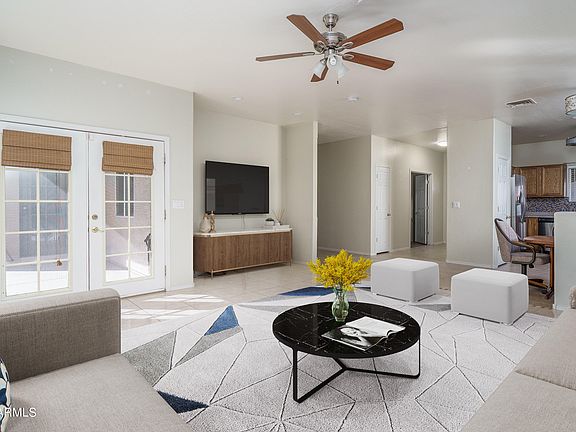This move-in ready, energy-efficient home offers 3 bedrooms & 2 baths in 1448 SqFt with an open great room layout. The kitchen has oak cabinetry, Corian countertops, and stainless appliances. The spacious great room has tile flooring and French doors that lead out to the covered patio with ceiling fan and roll-down shade and a park-like backyard with lemon, lime, and orange trees; paver walkways, grass for kids & pets to play on, a 12x8 swim spa with shade covering, and an RV gate. There's no HOA in this community, so you can park all your toys at home! The primary bedroom has an exit to the backyard, and a private bath with dual sink vanity, oversized shower, and walk-in closet. One secondary bedroom has double door entry and built-in cabinetry with a desk, shelving, and a Murphy bed,** perfect for a bedroom and/or home office. Other features include a new A/C (1-year), OWNED SOLAR (no solar payments!!), R26 insulation, R35 ceiling insulation, new Pella Low-E windows, a new roof, sunscreens, security doors, a skylight in the hallway, laminate flooring in the bedrooms (no carpet), inside laundry, and a 2 car garage with epoxy floors and overhead storage. Refrigerator, washer, and dryer are negotiable. Schedule your showing today!