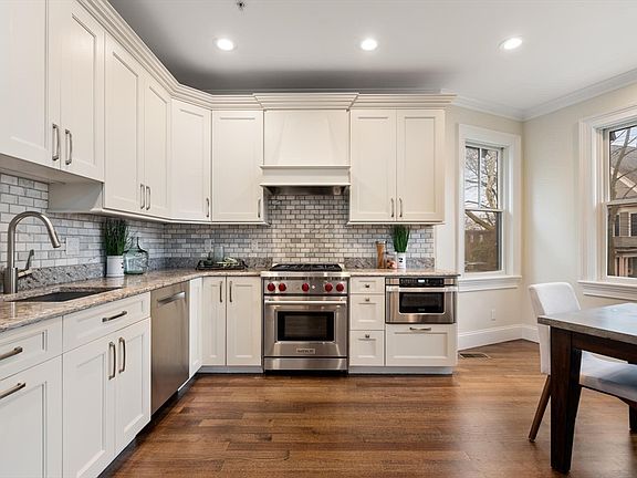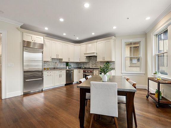 Natural light fill this 2017 gut renovated condominium on a tree lined side-street in sought-after Washington Square. With two spacious living levels, this unit is an excellent single-family alternative offering open concept living/dining room, luxurious appointments, private balcony, direct entry garage and one outside parking spot. The kitchen has beautiful custom wood cabinetry, Sub-Zero and Wolfe appliances, granite countertops - perfect for entertaining and everyday living. The first floor has a generous primary bedroom with contemporary en suite bath with enclosed-glass shower and soaking tub; and an additional bedroom with en suite bath. There are two more bedrooms and family room. Additional highlights are hardwood floors, richly detailed crown molding, in-unit laundry, two zones of high-efficiency heating & cooling, modern bathrooms w/mosaic designed & floating vanities.