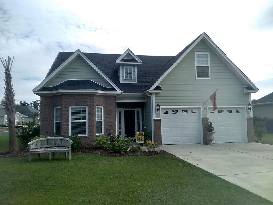 Unfurnished home with 2-car garage. 7 years young and feshly painted. Hardwood floors and tile in bathrooms. Carpet in bedrooms. Open floor plan. 3 bedrooms are downstairs and 2 full bathrooms. The master bath has a large easy step-in shower, 2 sinks and a separate commode room. Also a walk-in closet. All on one floor besides the large room upstairs with private full bath. This could be a guest room, game room etc. Beautiful screened-in back porch. Minimum 5 month rental. Preferably 1 year or longer. Located in a beautiful, small and friendly neighborhood. On cul-de-sac. Great schools. Central location. 1/3 mile off HWY 17. Only 1 mile from the Little River Waterfront entertainment and festival area. Nice screened-in porch on back, off dining area. 1/4 ac lot. 2-car garage with extra-long driveway. Washer/dryer, Refrigerator and microwave are provided. Small friendly and active neighborhood. Great for walking, biking and making new friends. Ready to move in. Renters responsibilities are: paying for all utilities and upkeep of the yard. Adhere to current HOA rules. One cat allowed in home.