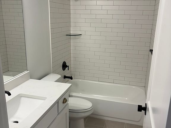 Full bathroom with tiled shower/bath combo and modern cabinetry