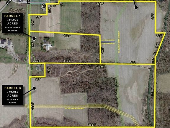 PARCEL #1: ±21.922 acres with frontage on Batdorf Rd. featuring a spacious ±2,672 sq ft century home, a solid, well-maintained bank barn, pasture, and woods. The 4 bedroom, 2 bathroom century home includes beautiful, original woodwork, high ceilings, large rooms, and ample storage. The bank barn has plenty of space for livestock or storage including a solid and dry barn floor with large hay mows, granaries, 8 newer horse stalls downstairs, and a cemented 25x42’ shop area with storage upstairs. The property also includes fenced in pasture and a woods perfect for hunting or recreation. PARCEL #2: ±57.321 acres with frontage on Batdorf Rd. and access on Louise Ave. / Barnes Dr. This parcel includes a large portion of tillable ground, plus woods with the potential for hunting, recreation, or timber. PARCEL #3: ±79.050 acres with over 1,000 ft of frontage on Batdorf Rd. This parcel also includes a large amount of tillable ground, plus woods with the potential for hunting, recreation, or timber.