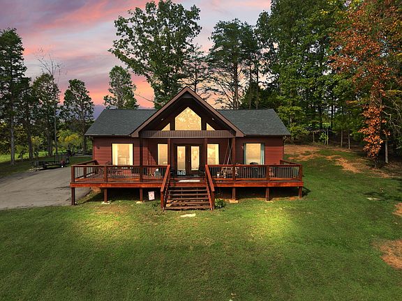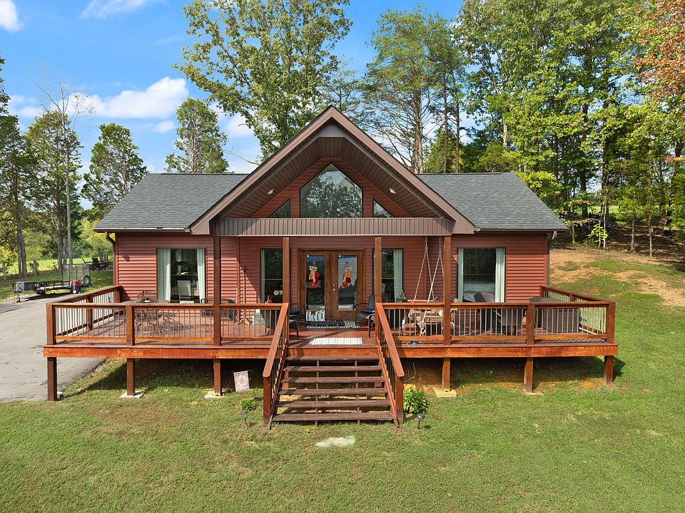 Relax on the spacious front porch with seasonal lake views or sunsets while sitting around a custom fire pit.