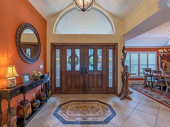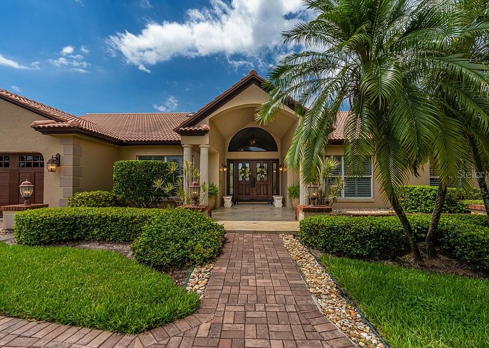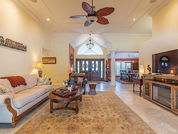 Gorgeous golf-view home with beautiful nightly sunset views. This spacious home has an open and inviting floor plan, high-end finishing touches, and private panoramic golf views. There are 4 bedrooms, 3 full baths and a large kitchen with granite countertops, exquisite flooring, large pass thru window, open to the family room with cherry built-ins, wet bar, and cozy wood-look tile flooring. Kitchen & other living areas have 20" tile on the diagonal with insets for accents and custom mosaic tile medallion in the foyer. Lots of closet space, oversized paver lanai, and sparkling heated pool add to this custom luxury home. All hurricane windows and sliders throughout the home, except for front door. Beautiful paver driveway is circular in shape, perfect for guest and/or boat parking. 2 newer A/C units help to keep the home nice and cool, and keep the costs down. Massive half-acre of mature, lush landscaping keep the nightly sunsets tropical & magnificent! This wonderful neighborhood is close to terrific shopping, dining, and close to the gulf beaches and within 20 minutes to the International Airport. Call today for your private showing!