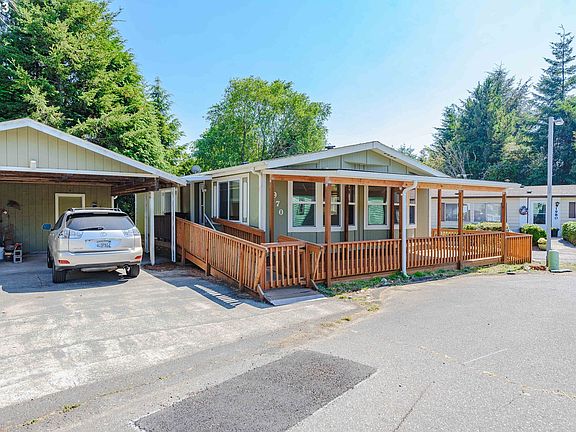 Very clean, ready to move in two bedroom, two bath manufactured home located in a 55 or older manufactured home park. Carpets recently professionally cleaned. Home is in excellent condition and offers a ramp entry with deck and fenced in yard - great for pets, if approved by office. Located near a relaxing pond within the community. 8.3 miles to Bastendorff Beach and 10.4 miles to Shore Acres State Park. Must be approved by Shorepines Mobile home park. All appliances including washer and dryer are sold with house. Ask your realtor for the completed pre-inspection.