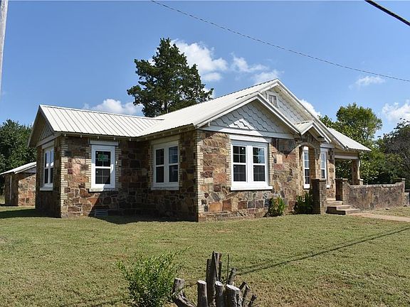Attractive rock work, new metal roof, completely remodeled interior, 2 car detached garage/shop building, large pond, rural yet close to town. All new replacement windows. Heat and air system will need to be replced at buyers expense.