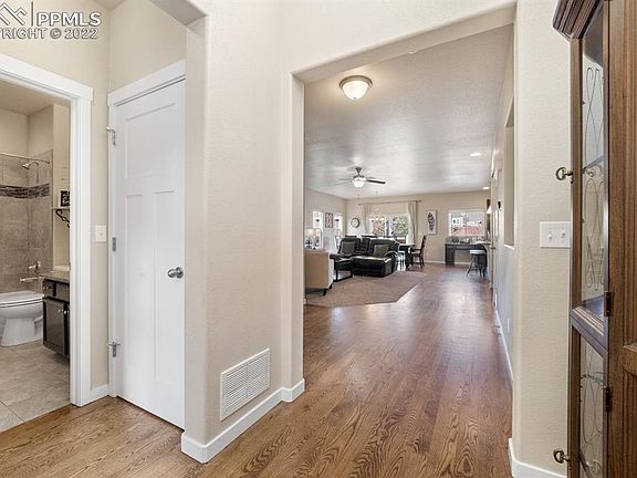 Fabulous Monument Home with easy access to District 38 or District 20 schools. A charming covered front porch welcomes you into the home! The foyer has beautiful true wood floors (recently refinished) that continue throughout the hallway and into the kitchen and dining areas. The great room has a gas fireplace to enjoy gathering around with family & friends. The gourmet kitchen is sure to please! A large center island with additional seating, granite countertops, matching stainless slate appliances, a gas cooktop & a desk area are just some of the extras to enjoy! The dining area is adjacent to the kitchen and has a walk-out to the large backyard that is fully-fenced and landscaped. Don't miss the mud room/kids drop zone that includes cabinets/countertop and is perfect for charging everyone's electronics! Bonus bedroom & full bath located on main level - perfect for in-laws or guests or use as a home office. The second level of the home has tons of natural light & a small loft area to be used as you wish. The master suite is spacious and has a 5-piece en-suite with double vanities with granite, a soaking tub, a walk-in shower and a large walk-in closet! 2 additional bedrooms, another full bath and a laundry room complete the second floor. Down in the fully-finished basement you will find a place that family members of all ages will enjoy spending time! Off the stairs is a cut-out with a fun slide for the kids to enjoy along with a finished play room under the stairway and around the corner is a "built-in bookshelf" that is a door to storage or a kids-hideout. The grown ups will enjoy the custom shiplap woodwork, barn door, faux fireplace (electric) with heat source & a custom wet bar! There is another bedroom and a bathroom with a walk-in shower providing even more space for family or guests! Enjoy Santa Fe trail hiking/biking! A beautiful home with custom touches & a great design....come see this one! MOTIVATED SELLERS OPEN TO BUYER CONCESSIONS.