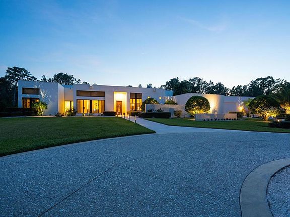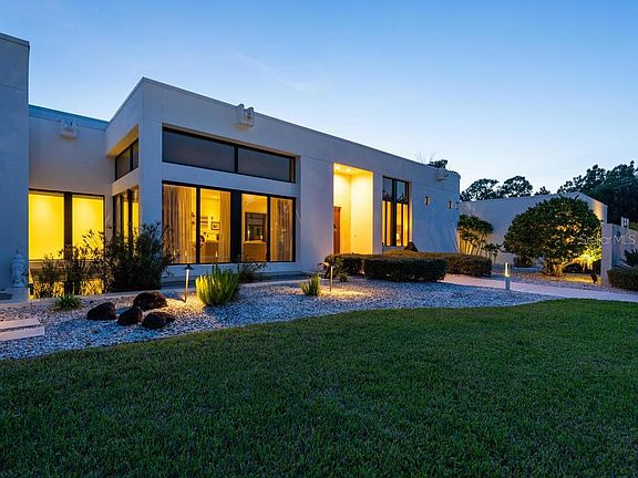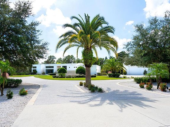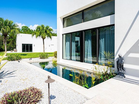 *VIRTUAL SHOWING AVAILABLE* "Warm Modern" best describes this award-winning custom home designed by Sarasota Architect with ADP Group. Updated and set on almost 8 acres of lush landscaping and 2 full stocked ponds, this 3 bedroom, 2 1/2 bath home and expansive gym total approximately 4,700 sq ft. of air conditioned living space. Solidly built, featuring volume ceilings, centered by a courtyard to provide cross ventilation & a cascading fountain wall to create a haven of unrivaled comfort and style, perfect for entertaining. The craftsmanship is evident throughout w/extensive walnut trim and doors, travertine tile, Namibia granite, stainless appliances (including 2 ovens and 2 refrigerators), generator, PGT windows and doors, landscape lighting, and 2016 pool pavilion like no other with 10 person spa, gas fire feature and waterfalls. Remodeled master bath w/ glass doors lead to an exterior shower. Office with handsome custom built-ins. Two Koi ponds sit at opposite ends as horizontal edges to "contain" the structure. All designed elements were carefully selected with utmost care to create an illusion of transparency, showering you with natural light and bringing the outdoors in. Garage space for 8 cars and 12' tall doors for RV or boat storage. Wireless coverage for full home and pool area with other systems that can be controlled from your phone. Extensive list of other updates. Panther Ridge has low HOA, no CDD's, LWR Schools, and only 8 miles to ODA upper campus. You won't want to leave home. You can truly have it all.