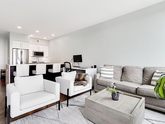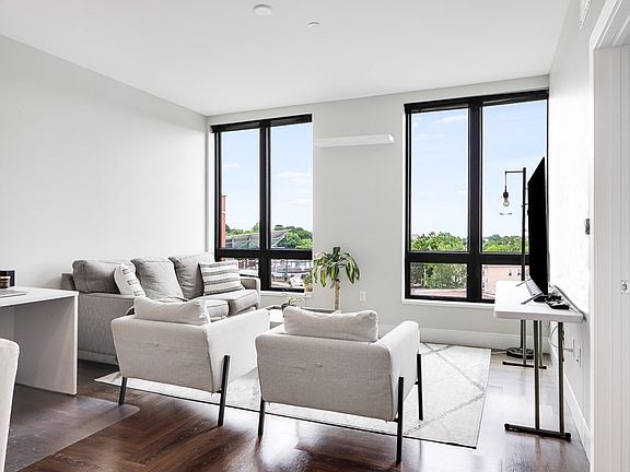 Beautiful one bedroom with stunning views in the Treadmark, one of Dorchester's most recent new construction buildings perfectly located across from the Ashmont T Station! This fifth-floor one-bedroom/one-bathroom condo features an open concept living space/kitchen perfect for entertaining. Cook up a storm in the carefully-designed chef's kitchen, highlighted by quartz countertops, state-of-the-art stainless steel appliances, and an oversized island/breakfast bar perfect for food prep and dining. Hardwood floors throughout and extra-large windows fill the space with tons of natural light. The bedroom can accommodate a king-size bed, and the stylish barn door leads to the masterfully-designed custom walk-in closet and direct access to the updated bathroom. Additional unit amenities include central air, Nest Thermostat, and in-unit laundry. A common roof deck and a serene garden area are also available to residents. One garage parking spot included.