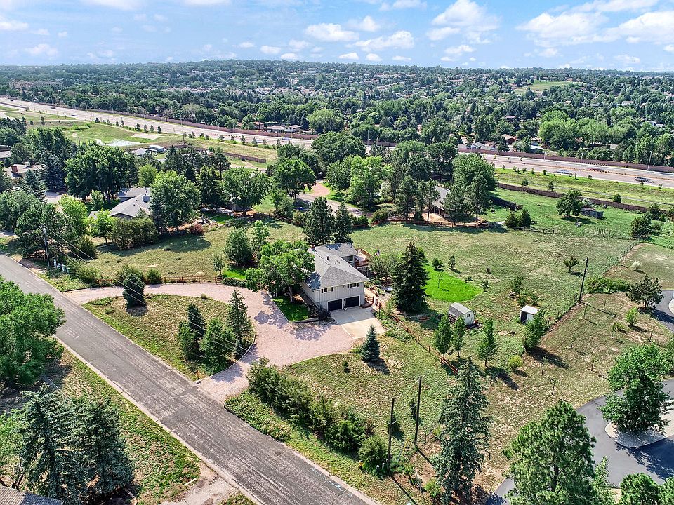 A gorgeous home on 1.71 acres in the heart of northern Colorado Springs. Country living in the city. The property is within easy walking distance to nearby shops and restaurants on Academy Boulevard, while boasting fantastic mountain views of Pikes Peak to Cheyenne Mountain. This meticulously updated 5/3/2 is located in coveted, rustic Falcon Estates, where minimum lot size is one acre and it is zoned for horses. The bright, open-concept main living area has double-sided gas fireplace, and kitchen has new stainless steel appliances and granite countertops. The open living/dining/den concept allows for much versatility as far as furniture arrangement, and the sunny second den area overlooks back yard. The master and two other bedrooms are located upstairs. The garden level basement includes another large family room with wood-burning fireplace, bedrooms, bath, large laundry room. The 5th bedroom/flex room downstairs along with a bonus room currently being used as a home office lead directly out to the back yard. The property also offers gated access from Bell Circle. Garage is oversized and heated with storage closet. Lushly landscaped yard includes pole-pine fencing, chicken coop, Koi pond, fire pit, and waterwise in-ground sprinkler system. Acreage beyond immediate yard is natively landscaped with plenty of room to add tennis court, swimming pool, additional garage, or stables. Students attend award-winning School District 20 and there is quick access to I-25 for easy commute to Denver. More details: City water and city sewer - not septic! Many homes in Falcon Estates are still on septic and will need to be updated, this home is already tied in to the city sewer system, saving new owner many thousands of dollars; Central heat and air; 1.71 acre lot, almost twice that of other lots in neighborhood; 3 inch custom red oak flooring; Custom maple Pella Windows in great room and downstairs bonus room; Champion Storm windows throughout home; New kitchen appliances from Sears and Kitchen Aid; 3 thousand linear feet of pole pine fencing from Casey Lumber in Woodland Park; Garage is insulated and heated with remotes, key pad entry, and security pad locking system; Waterwise In-ground sprinkler/irrigation system was professionally installed using MP rotators, Sprinkler system is on an automatic timer located in the laundry room and can be adjusted.