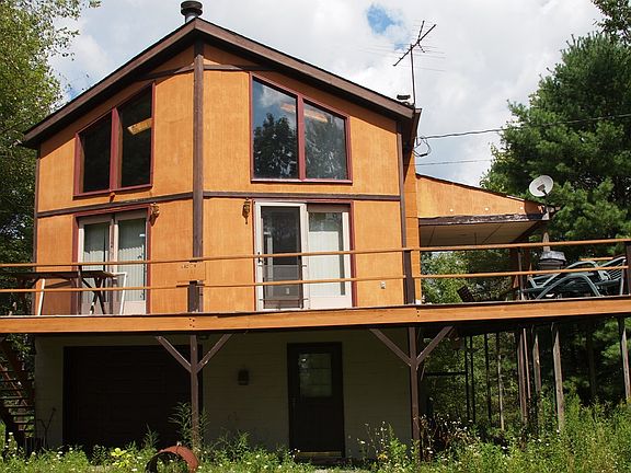 PRICE REDUCED!!!! Just a little TLC will bring this lovely home back to life! This 3 bed 2 bath A-frame style house has cathedral ceilings with skylights, double sliding glass doors leading out to the partially covered deck. The second floor holds the master bedroom suite with a 3/4 bath and sitting area. The open kitchen, dining and living area provides for great entertaining of family and friends. Basement has 1 car garage and laundry area and still leave plenty for storage. All of this on 40 acres with a pond to enjoy as well.