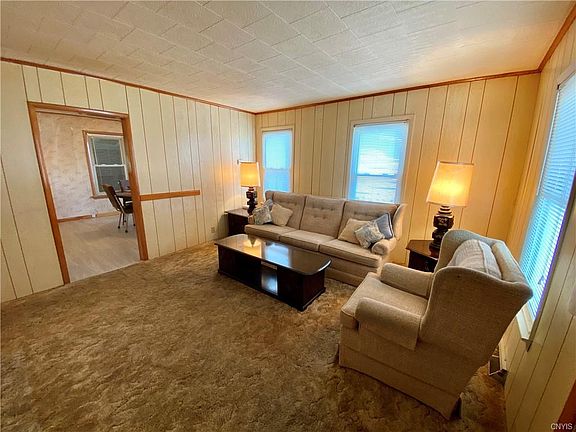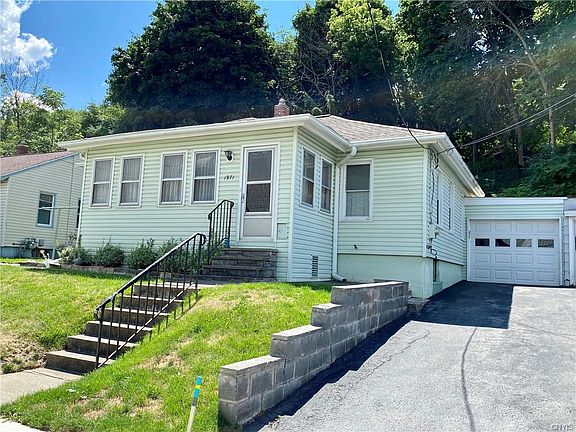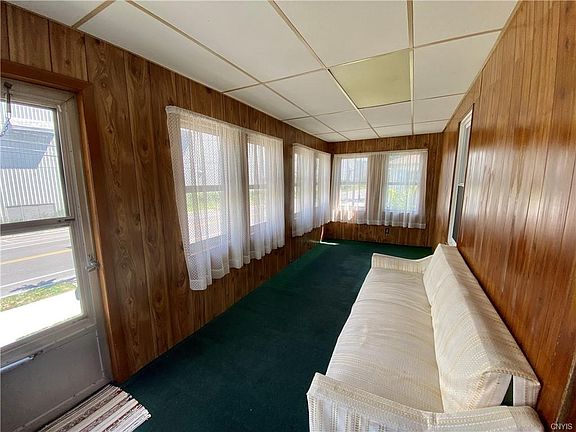 Cute village Ranch featuring bright enclosed front entry sitting porch that opens to nice size living room offering older style wood floors under carpeting and linoleum, 2 bedrooms plus den that could be possible 3rd bedroom, full bath with tub/shower. Spacious kitchen to eating area with back enclosed entry to storage area and 1-car garage. Back door access to tiered private back yard and wooded backdrop. Basement offers partially finished rec room, open laundry, wine cellar and workbench area. All featuring vinyl replacement windows, central air, vinyl siding, circuit breakers and low cost Solvay Electric!