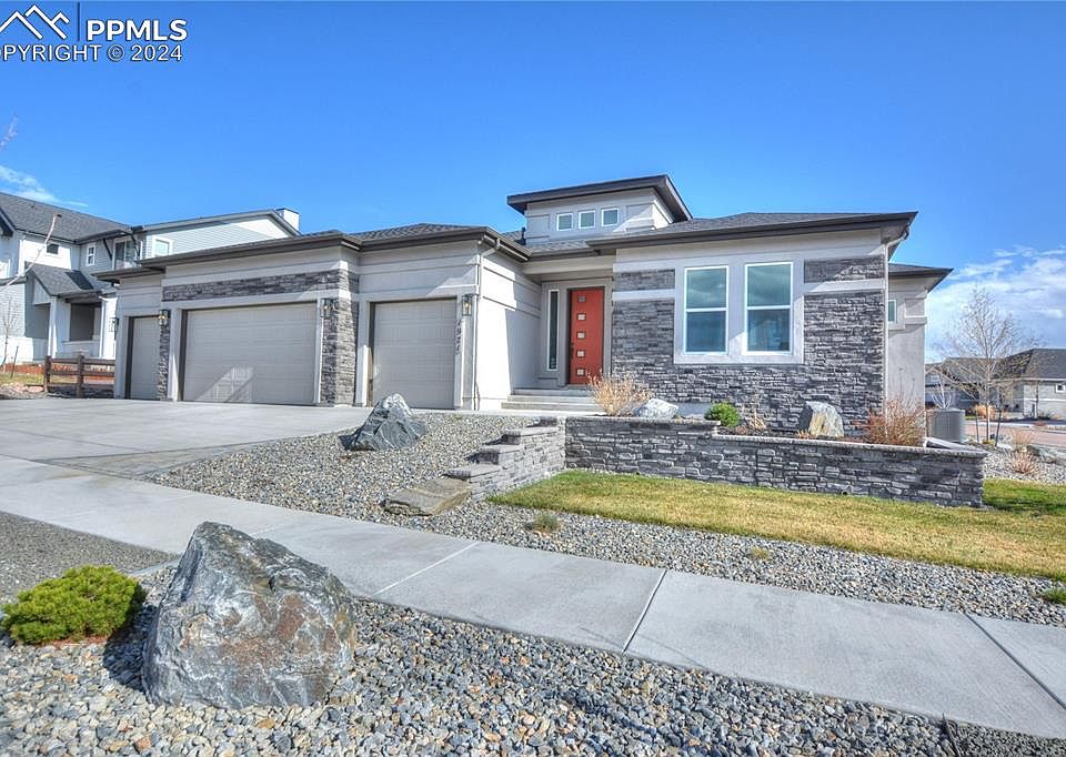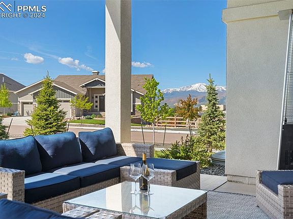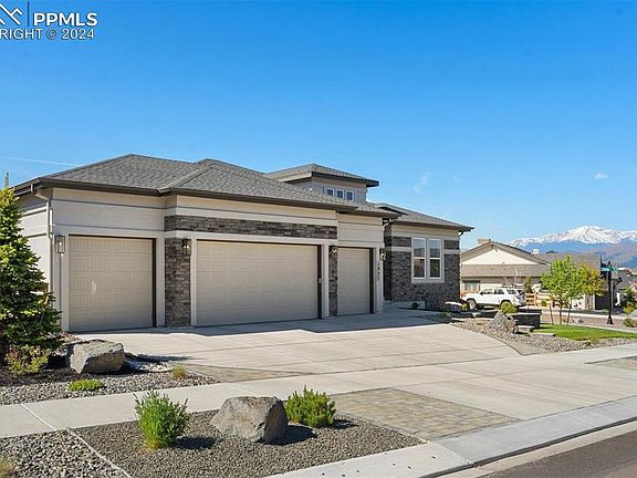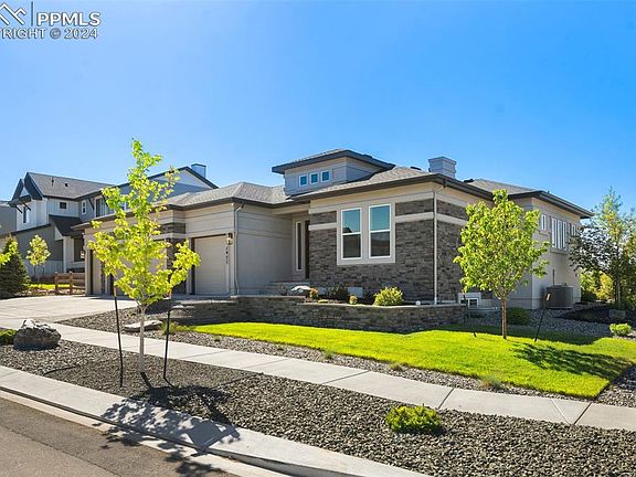 Large, upgraded GRANDVIEW 4-CAR Classic Rancher in Flying Horse, situated on wonderful corner lot with forever views of Pikes Peak. This Elegant very livable plan has it all and is finished more beautifully than the current Model. Very Open main level with massive Great Room, Gourmet Kitchen with oversized island, 5 burner gas stove top, with tons of natural light and walk-in pantry. Adjacent, a huge covered Patio with excellent Pikes Peak views and southern exposure offers plenty of room for entertaining with easy walkout access from the Dining Room and Family Room, with plenty of room for an outdoor kitchen or BBQ. All four of the exceptionally large Bedrooms feature walk-in Closets. The Master Bath is extraordinary and Spa like with a freestanding tub for ultimate relaxation and a exquisitely finished walk-in shower with seat and two shower heads. In the Lower Level, a Game Room with a stunning wet-bar, second Family room for a TV room or a Home Theater and an office area round out the finished area. There is also room to add a fifth Bedroom as noted in the unfinished storage area listed. Come see this Elegant, highly upgraded, wonderful home. Side of garage has large, fenced dog run. Within walking distance to the exclusive PRIVATE Flying Horse Club (membership not included)