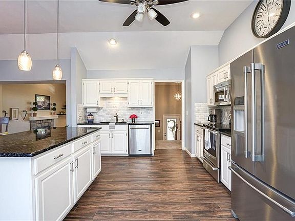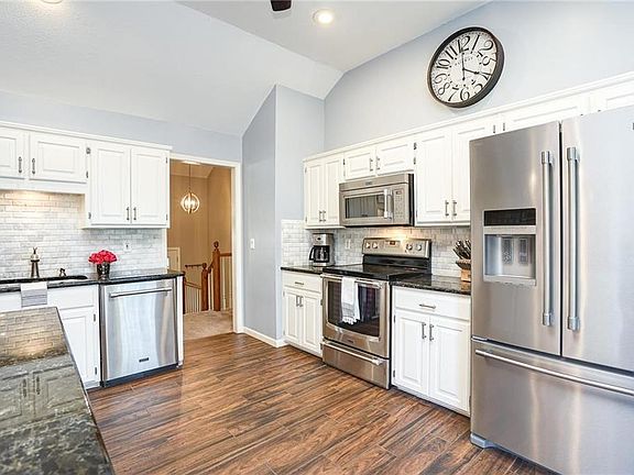 Don't miss this beautiful updated home backing to green space for breathtaking views! 4 bed/3 bath. Airy floor plan w/ ample natural light, vaulted ceilings & fresh paint throughout. Gorgeous updated kitchen with granite countertops, expansive island, newer SS appl. tiled flooring. Spacious living rm. Master bdrm includes luxury en suite! Granite dbl sink, ceramic tile, free standing tub & rainfall shower. Enjoy the walk-out LL, perfect space for watching the KC Chief's WIN!!