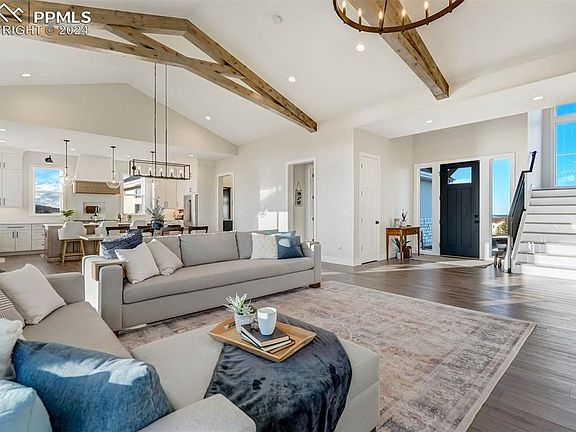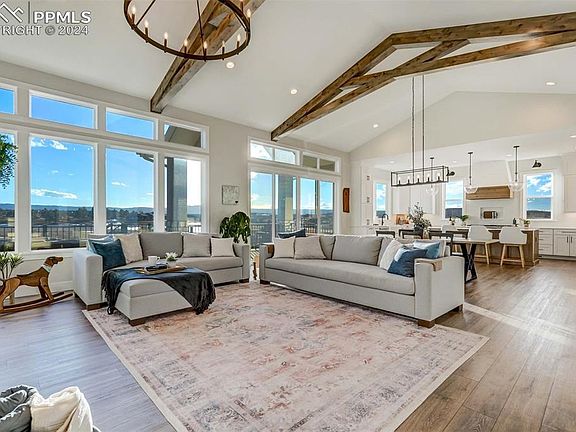2021 custom Gowler home on a cul-de-sac w/2.84 are lot, backing to Kings Deer GC & boasts unparalleled views of Pikes Peak & the Front Range. Immaculate craftsmanship shines throughout this home. As you enter wide plank knotty alder luxury vinyl floors greet you & flow throughout the main lvl. The kitchen f/stunning Calacatta quartz island w/breakfast bar, pendant lighting, apron sink framing Pikes Peak, Thermador appl, custom hood, textured subway tile backsplash, gorgeous ceiling high cabinets w/counter lvl appl garage, & walk-in pantry. The adj dining area flexible for large tables, f/linear chandelier. From here walk-out to covered composite deck capturing panoramic golf course & mtn vws w/built-in bar & gas line for grill. The great rm impresses w/vaulted ceilings boasting timber trusses, flr-to-ceiling stacked stone gas FP, shiplap accents, & wall of windows. Main lvl primary suite w/paneled accent wall, mtn views, smart shades, walk-in closet, & luxury 5pc ba. The bath has a soaking tub, flr to ceiling tile shower, designer mirrors, & separate dual vanities. Finishing the main lvl is the mud rm w/laundry, sink, storage cabinet, & bench seat w/storage. Upstairs you'll find a 2nd suite, w/walk-in closet & private full ba w/herring bone subway tile & quartz vanity. Of the 2 additional upper bedrms 1 has incredible views while the other has custom paneling. Both share easy access to hall laundry & full ba w/ dble vanity & separate commode/shower. Flex rm upstairs could be office/craft room/studio & more! Walk-out bsmnt offers access to 20x10 concrete patio, 9’ ceilings, pre-plumbed for wet bar & bath, ready for your perfect design or playrm/storage. Oversized 4 car garage (27’deep w/10’door) w/ rm for full size trucks & toys w/ease. 220v plug for EV, insulated finished walls, hot/cold spigots & flr drains. Enjoy extra water rights for grass area w/irrigation, Central A/C, 2 HE furnaces, UV coated windows & more! Easy access to D-38 schls, shopping & main roads.