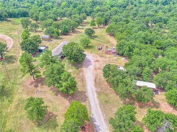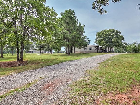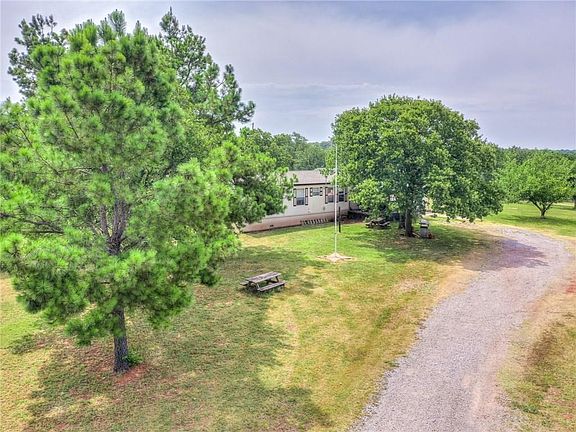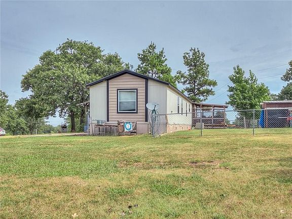 Wonderful acreage in Luther. Newer bamboo flooring in the living room and hallway. Vinyl plank flooring in the master. Updated farm sink and faucet in the kitchen, and new dishwasher to be installed by August 10. It has a screened in back porch, and the back yard has an enclosed pet fenced area, with a covered dog kennel, approximately 8'x16'. Other exterior features: 12'x16' enclosed storage building, 30'x10' three-sided loafing shed, chicken coop, another shed, trail, storm shelter (2013), and fire pit, on gorgeous land. Field fence surrounds property, with gate at entry, and an additional gate on the east. Moved only once, to its current location, has concrete runners, single wide, and went FHA when they purchased with a structural engineer checking it out. County maintains the roads!