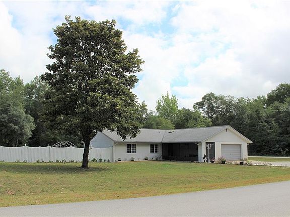 Meticulously maintained and cared for, this house is move in ready. It is even being sold fully furnished. Screened front entry has room for relaxing and enjoying the fresh air. Home is bright and inviting. Living room, hallway and guest bedrooms have painted concrete flooring that looks like tile floors. Bedrooms are spacious. Dining area has laminate flooring, fireplace with heatilator and skylight and connected Kitchen has been updated to include wood cabinets with soft close doors and drawers, flooring, appliances and movable wood island with storage. Sunlight pours in from a solar tube over the sink. Master bedroom has his and her's closets, carpet and wainscoating. Guest bathroom also has a skylight. Other bonuses include spacious oversized garage, all new windows and screens and back porch has sliding windows that can be inserted for year round use. Seller also has hurricane covers for all windows and there is plenty of slate along the back of the house to make a nice outdoor patio. There is a metal shed for storage and a large 12X24 workshop in the back. For those with a green thumb there is a fenced area in the back which is set up as a garden but could also be for a dog. Home is being sold with all furnishings. Seller is downsizing. Home is located on a corner lot with almost 1/2 acre, landscaped with new plants in a quiet area toward the front of the community. Location is about 10 minutes to Rainbow River State Park for outdoor recreation, about 30 minutes to Lake Russeau for quality fishing and approximately 40 minutes to Crystal River on the gulf coast. For those with a need for speed and high performance, the seller also has a custom built 1986 Ford Mustang with 500 HP, 5 speed, dual carburetors, custom built sound system and Steeda suspension for sale for $10,000.