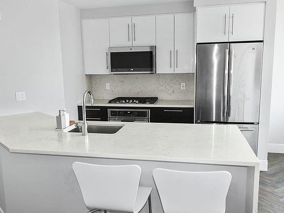 Your opportunity to rent in the luxurious Treadmark building. Absolutely stunning and spacious new construction 2 bedroom and 1 bath penthouse level condo available now. This pristine unit features open layout for entertaining, a perfectly designed kitchen with quartz countertops, ample cabinet space, large island, and state of the art appliances. A stylish bathroom and herringbone wood floors complete the look. Enjoy great natural light throughout with wide windows with spectacular views in each room. Spacious bedrooms including one with barn doors to your custom Elfa walk-in closet. The second and larger bedroom is not pictured. Other amenities include washer/dryer in unit, and a Nest Thermostat for ultra efficient heat and central a/c. Beautiful common roof deck lounge available during the summer as well as a shared garden and barbecue lounge. One underground garage parking space included. Elevator building with secure entrance.