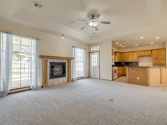 This sweet slice of Blanchard living is the total package! Well maintained and updated home on an acre, minutes from thriving downtown shopping, schools, restaurants and churches. Modern and open kitchen/living/dining plan with neutral colors throughout. Gas log fireplace in living area. Pantry, breakfast bar and smooth top electric ceramic stove in kitchen. Spacious master suite features whirlpool tub, seperate shower, private water closet and walk-in closet. 2nd bed has walk-in closet, 3rd bed has wood-look laminate flooring. Utility room has plenty of storage. Carpet installed 11/24, water heater 9/24, impact resistant shingles 2022. Guttering, backyard storm shelter, covered patio. No active HOA, neighborhood covenants are attached in MLS docs. Don’t let the fence line fool you, there’s lots more yard outside of the fenced area, see last photo and/or mls attachments for lot dimensions and overview.